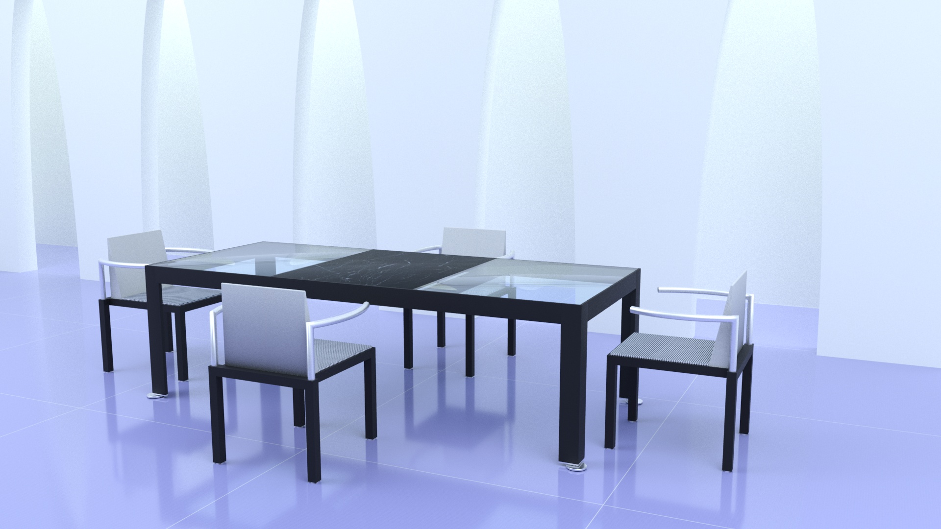 Avec des lignes épurées, la table Dalle encadre un plateau, puis avec ses pieds, au profil et matière similaires à sa ceinture, la relient au sol sur ses vérins chromés plats, larges et confortables.