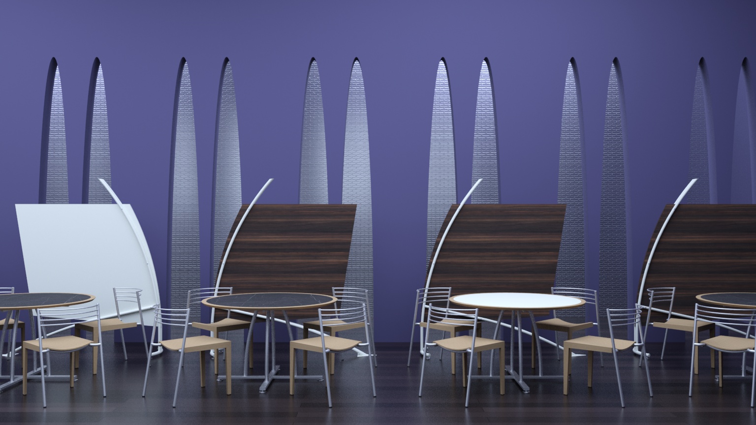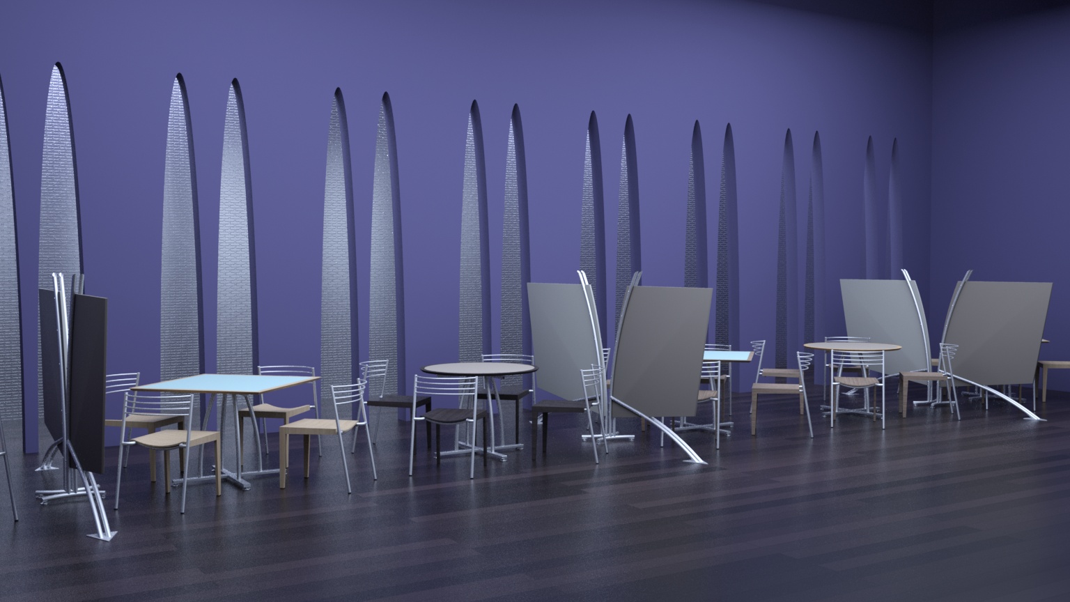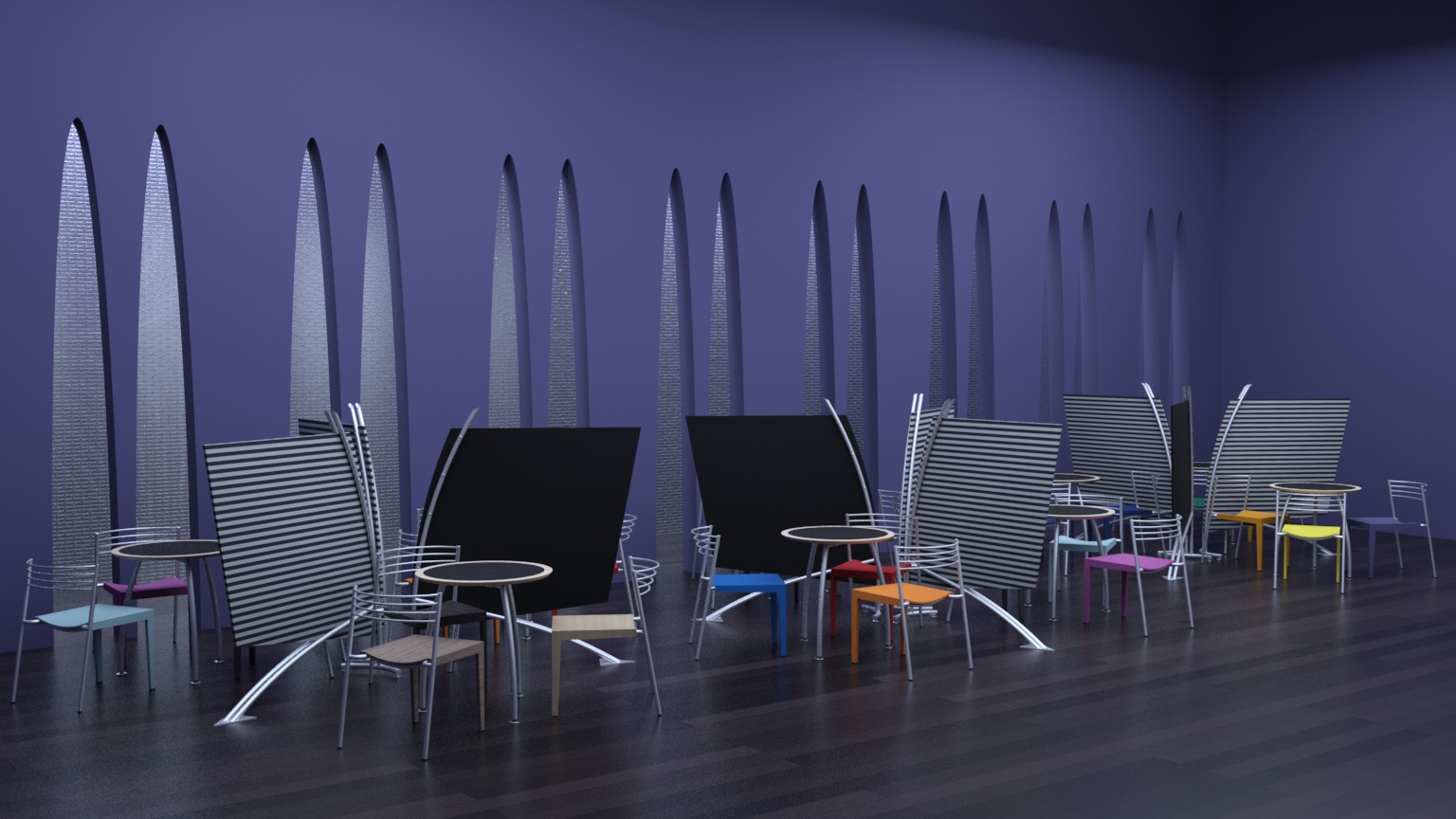 L'agencement présenté utilise des chaises aux assises aux finitions naturelles ou laquées de couleurs vives ; toutes les structures métalliques sont en gris aluminium et les panneaux des claustras, Vela, osent le noir et le rayé blanc-noir.