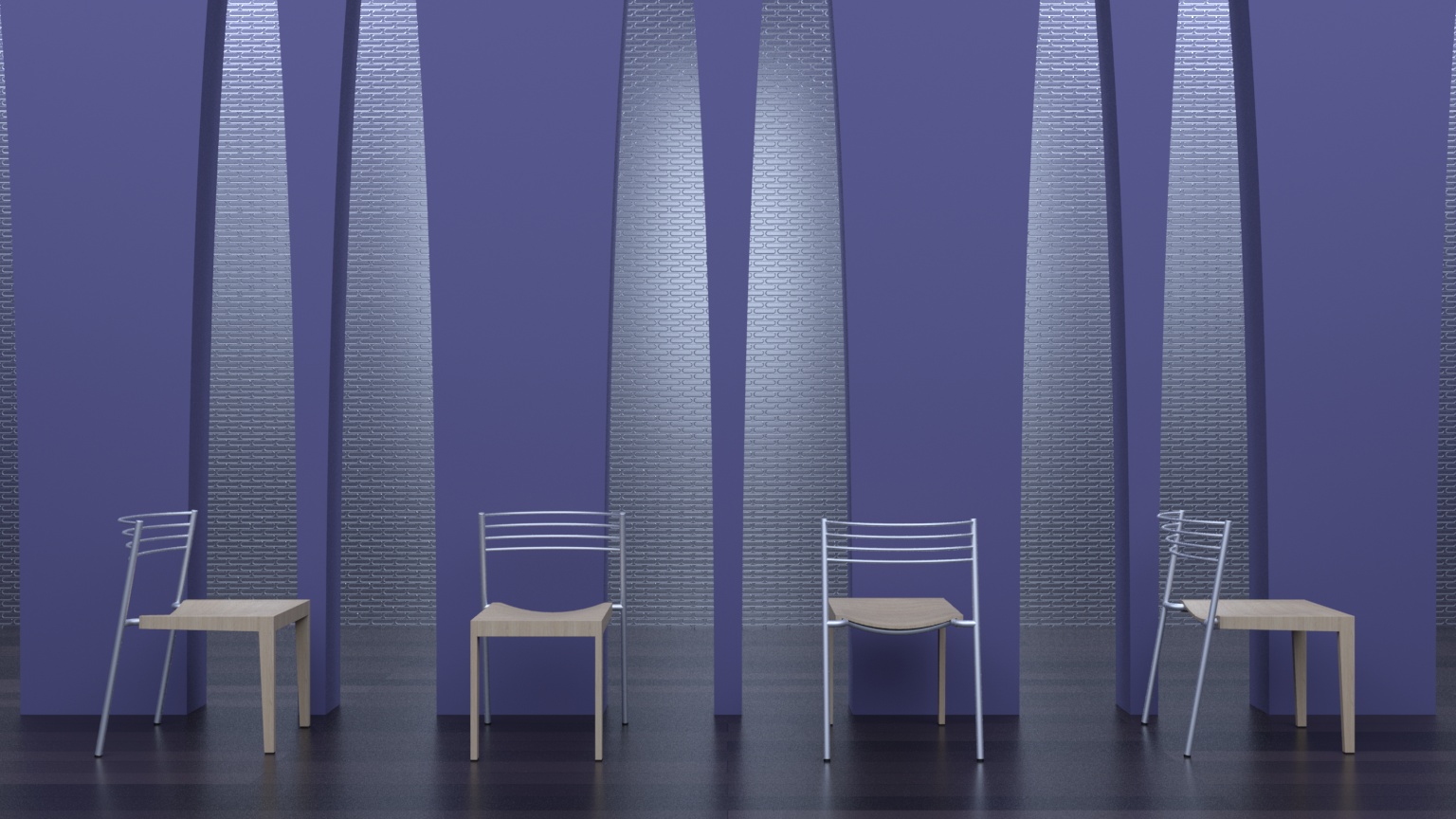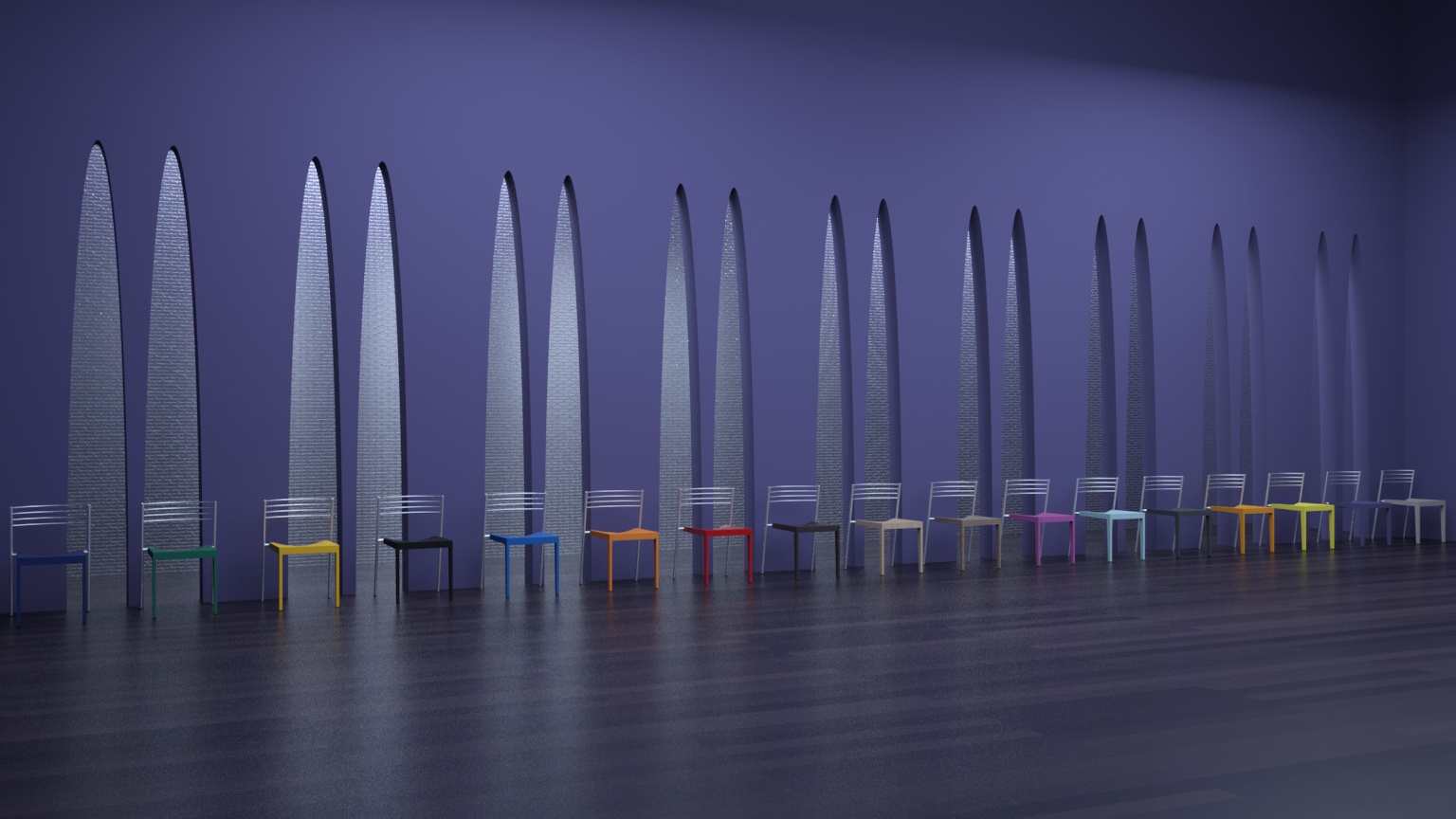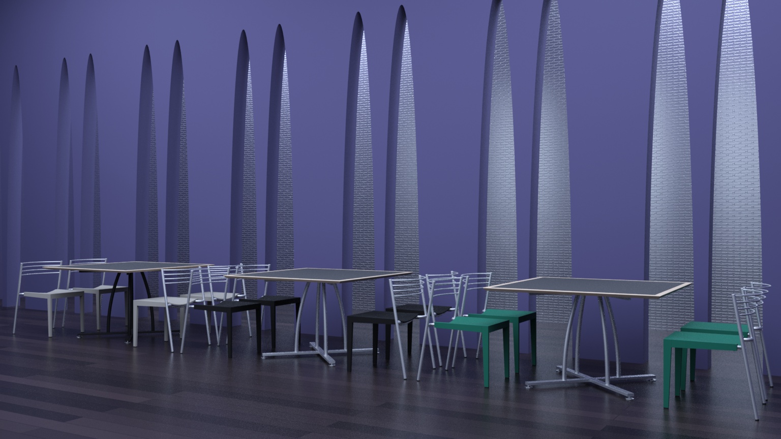 L'agencement présenté utilise des chaises aux assises aux finitions naturelles ou laquées de couleurs vives ; toutes les structures métalliques sont en gris aluminium et les panneaux des claustras, Vela, osent le noir et le rayé blanc-noir.