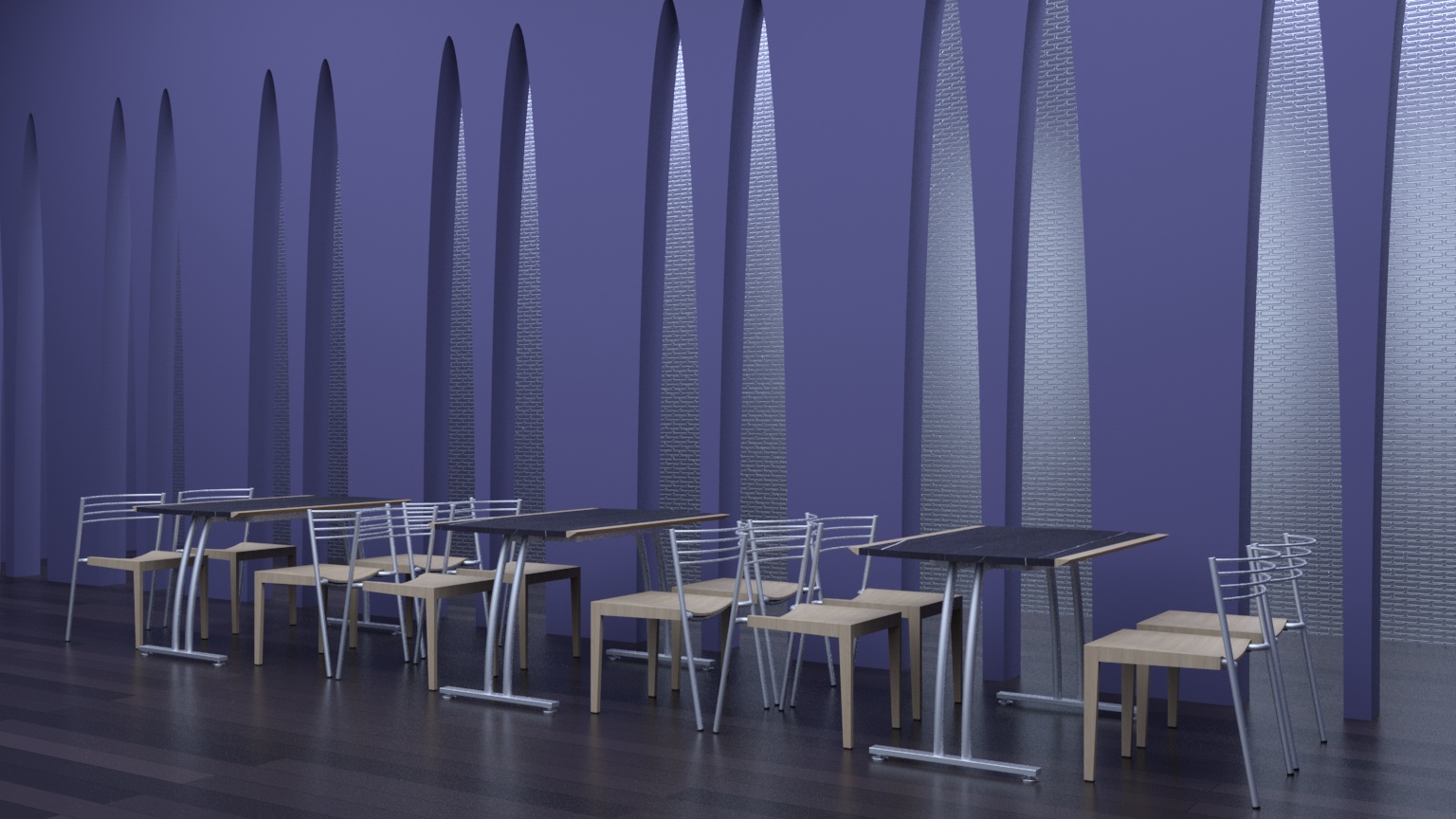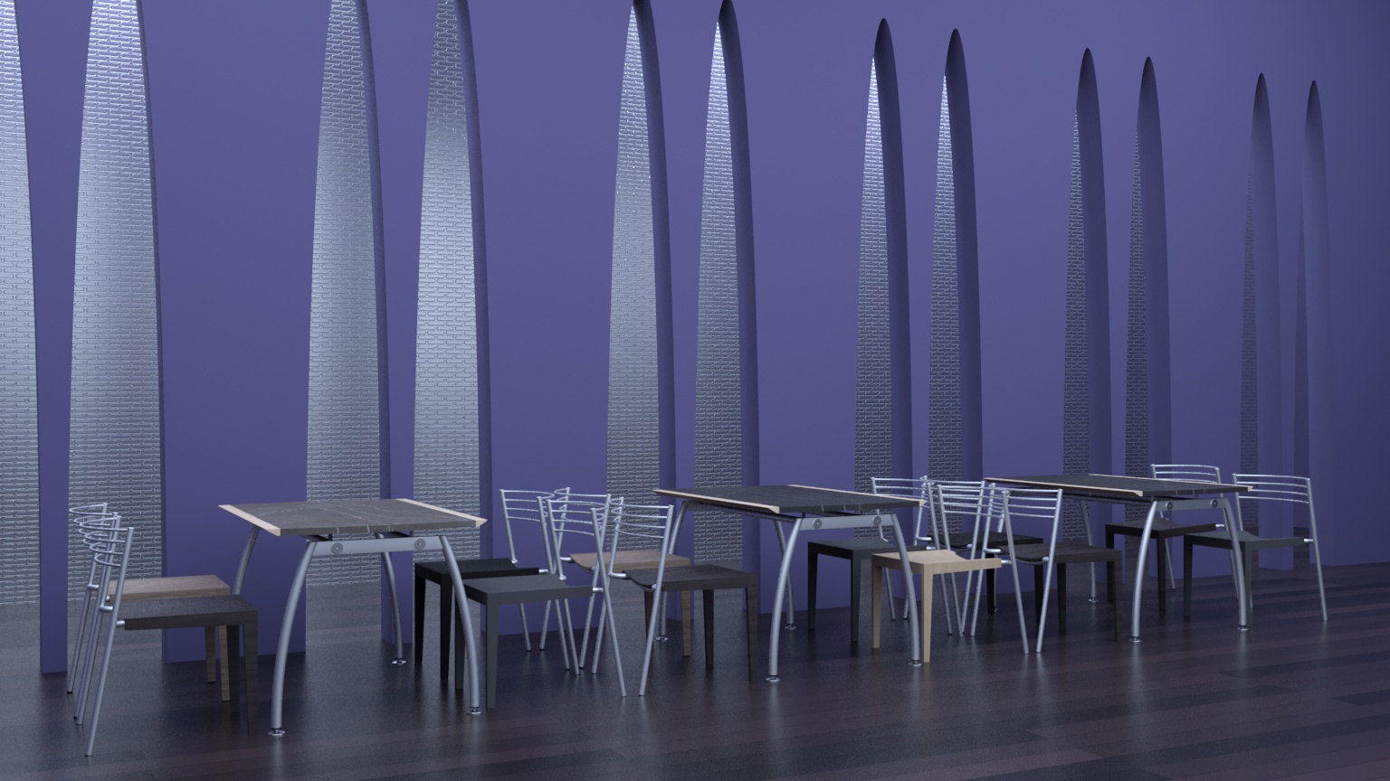 Pour les usages de la restauration collective, j'ai créé la table Oméga à piétement à dégagement latéral, en gardant les éléments identifiants : les tubes verticaux cintrées et le plateau avec ses chants différemment travaillés.