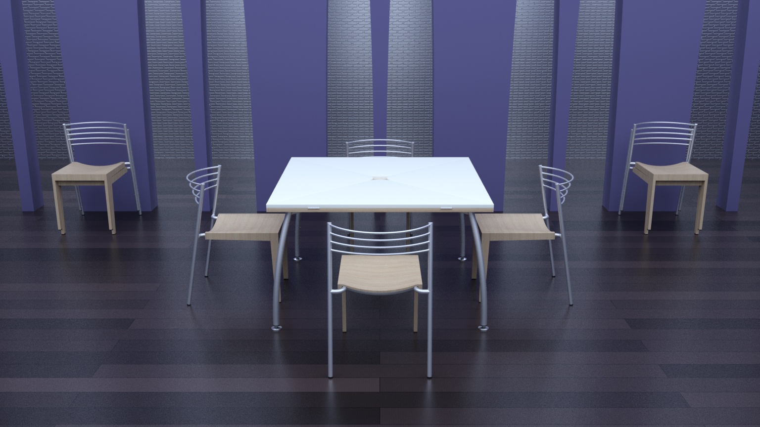 La table Oméga, 4 pieds fut la première créée, elle est caractérisée, par ses pieds cintrées soudés à une traverse, eux mêmes reliés par 2 longerons, et par son plateau, décollé de la structure, avec dans sa longueur : des chants alésés, chanfreinés en bois, et dans sa largeur, des chants cintrés, plaqués de la même matière que son dessus.