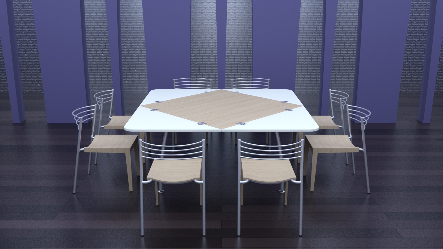 La table Oméga est la première à recevoir un plateau type portefeuille, qui permet de doubler sa surface et sa capacité, quand il est ouvert.